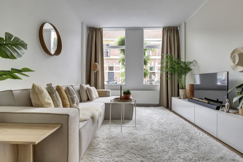De woonkamer is ruim van opzet en is door de suitekast en de schouw verdeeld in een voor- en een achterkamer. De voorkamer is in gebruik als woonkamer en hier is de zijkamer bij de woonkamer getrokken waardoor deze extra ruim is geworden. In deze voormalige zijkamer is op handige wijze extra bergruimte gecreëerd. In het woonblok zit een verspringing waardoor deze bovenwoning als enige in de rij een zijraam in de zuidgevel heeft wat niet alleen zorgt voor extra lichtinval maar tevens een leuk zicht door de straat biedt.